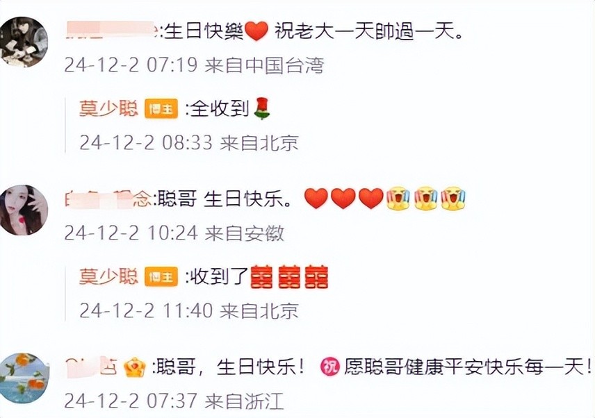 一些粉丝也给莫少聪送上生日祝福,莫少聪也有选择性回复网友留言,但在这次生日合照里,就没有看到莫少聪的二婚老婆孙云玲。