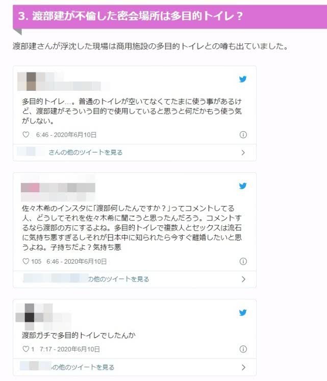 就在昨日(2020年6月9日),关于渡部建家暴佐佐木希的丑闻曝光于网络,他也主动申请暂停所有工作,第二天也就是今天,被爆出渡部建于多么女性发生不正当关系,其中甚至包括AV女优、女歌手、普通职员等等,据悉人员至少有6人。