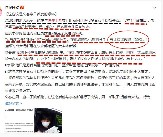 而且一位与渡部建长期发生关系的女性向媒体爆料,她与渡部建在其结婚前就保持性关系,而且持续到渡部建与佐佐木希婚后,甚至渡部建长子出生后,两人都保持关系。