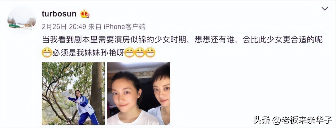 两年前的《安家》,孙俪发博跟大家介绍妹妹孙艳出演少女时期的“房似锦”。