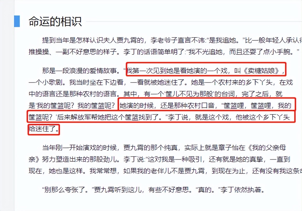 李丁后来回忆时说:“她在台上一声声喊着筐篮哩,筐篮哩....就是这个戏,她把我给迷住了”,