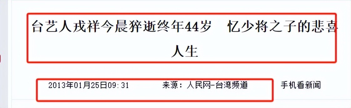 人民网-台湾频道 2013年01月25日 《 台艺人戎祥今晨猝逝终年44岁忆少将之子的悲喜人生》