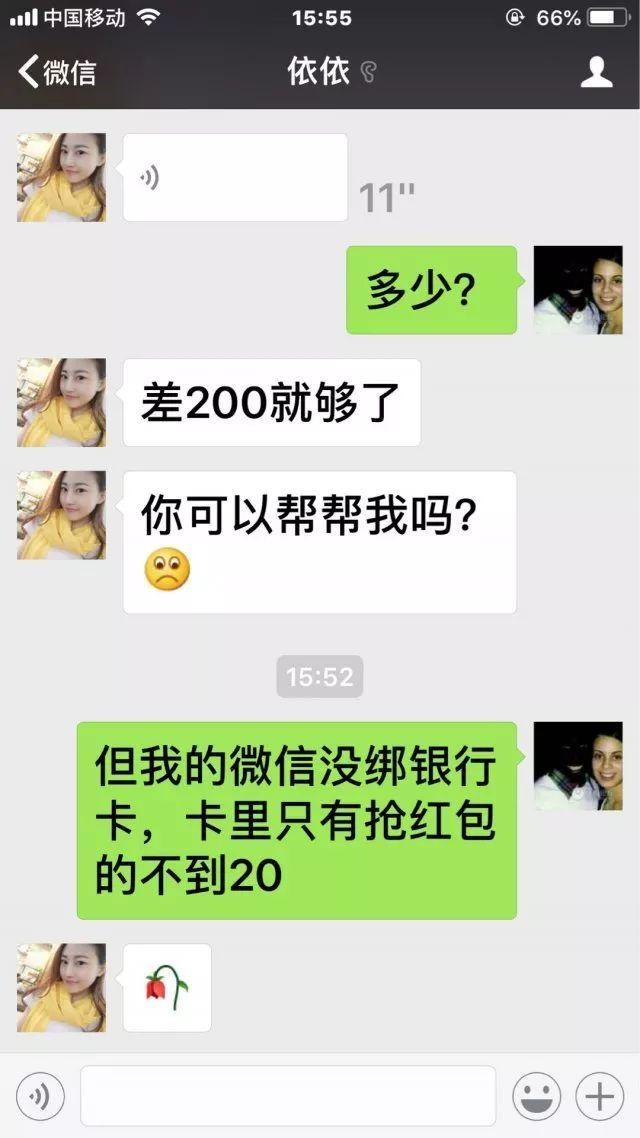 王先生介绍说,大概一个月前一个叫“依依”的广州美女加他,王先生问对方是谁,依依说,自己的旧通讯录里有他,应该是以前见过的朋友,王先生说他不认识广州的朋友,但依依一再要求加他,说加个朋友聊聊天吧。王先生就加了依依。王先生说,看依依的头像是个气质美女,朋友圈里是很正常的鸡汤类文章,随便聊几句天也很正常,不像推销员,但是他心里清楚,这么主动找上门的美女一定有目的,就抱着戏谑的态度跟依依随便聊聊天,看她究竟是何目的。以后的情节按正常套路进展,依依去做公益活动,显示她善良有爱心;依依失恋了,情绪低落;依依去武夷山散心,在外公的茶庄里学习炒茶;依依辞职创业,启动资金遇困难,茶店开业要祝贺,王先生一概装傻,只负责安慰鼓励,绝不出钱。后来依依直接开口,让王先生买点茶叶帮她冲销量,王先生说自己没钱,依依就不断降低要求,从几千元降到了200元。王先生说:“这么费劲聊了一个月,就骗200?太同情你了!”依依明白被识破,以后就不再理他了。