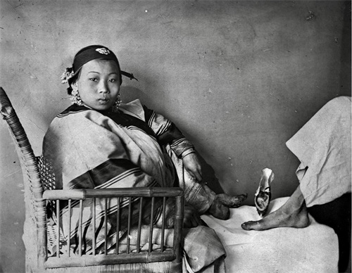 33、清末。以茶杯和天足为参照物的中国女人小脚照片。