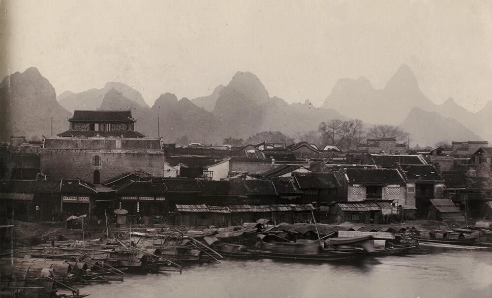 34、曾经的广西桂林城。沧桑的城门城墙围护着深邃的古街古巷。拍摄时间:1890至1921。由数个传教士拍摄。英国布里斯托尔大学收藏。绮丽的山水与质朴的古城在此地相遇留给了人类一幅可以穿行其中的奇美画卷。最后一图是现在的桂林市区一角。也不错~~家家户户都是山景房水景房。