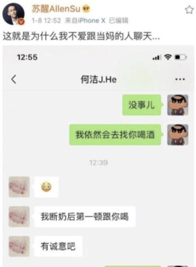 而在2019年1月8日,苏醒发了一张照片,内容是和何洁的聊天记录,吐槽何洁,表示自己不愿意和当妈的人聊天,被细心的网友发现何洁说自己还没断奶,随后引发网上热议,猜测何洁已经生下第三胎,父亲可能是有争议的刁磊。
