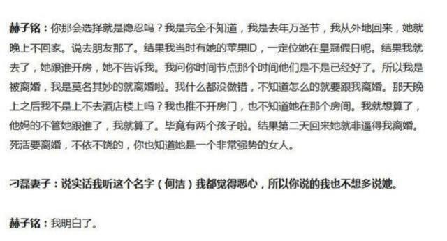 2017年12月14日有媒体曝光赫子铭和刁磊前妻的录音,指何洁刁磊地下恋情早就开始了,并且刁磊声称是为了保护她和孩子选择了离婚。