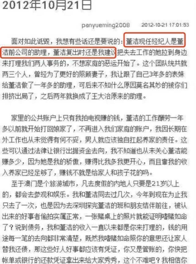 但到了2012年董洁发声明承认和潘粤明婚变,怒斥潘粤明嗜赌成性,性格粗暴,还负载累累。