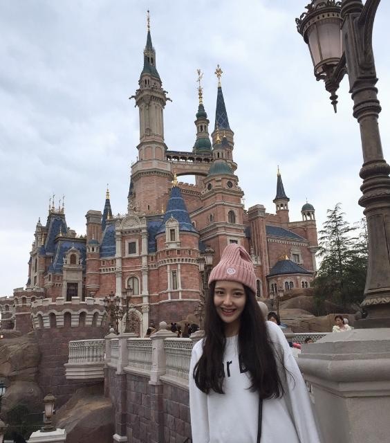 2017年2月王艺瑾发了一组迪士尼的图,她戴着粉色的针织帽,站在城堡前笑容很甜。