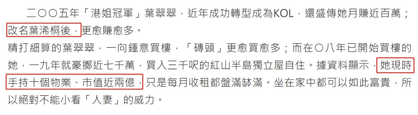 婚后,晋升为幸福人妻的叶翠翠,积极为夫家开枝散叶,成功实现四年抱三的愿望。随着新潮流互联网经济的发展,她积极转型当KOL(网红),月入近百万港币;此外,一向有经商头脑的她,投资有道,目前手握10个物业、身家超2亿,妥妥的人生赢家了。(图片来源网络,侵权必删)