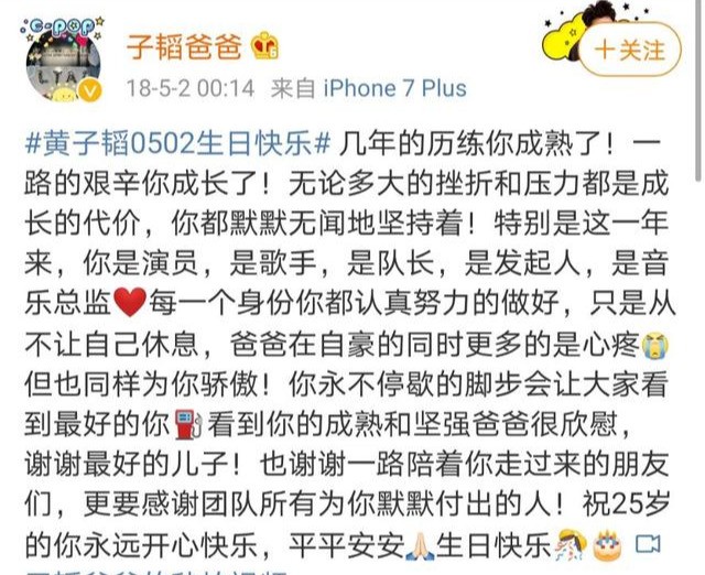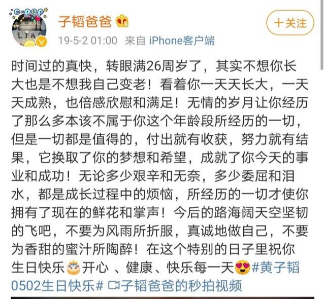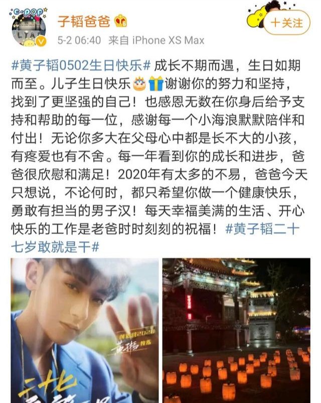 在生活中,通过韬爸的微博,我们可以真切地感受到他对黄子韬的那份深沉的爱。韬爸的微博不多,但是每条都表达了对黄子韬的鼓励;韬爸的最后一条微博停留在2020年5月2日6点40分,那天是黄子韬的生日,短短几百字的文案,都是对黄子韬的鼓励,他理解儿子的艰辛,理解儿子的理想,所以只希望子韬能够快乐健康
