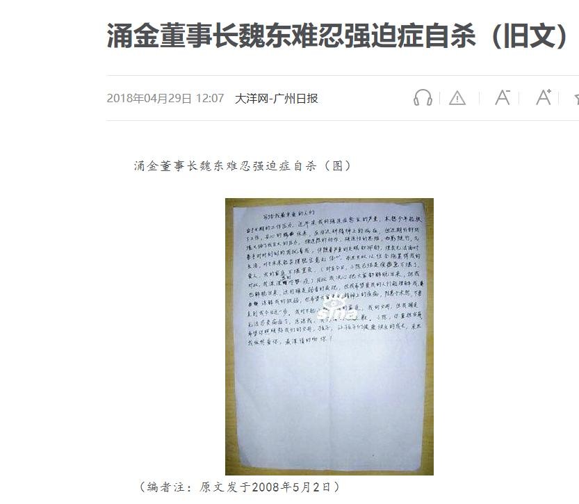 信息来源:大洋网-广州日2018-04-29报发文:涌金董事长魏东难忍强迫症自杀(旧文)