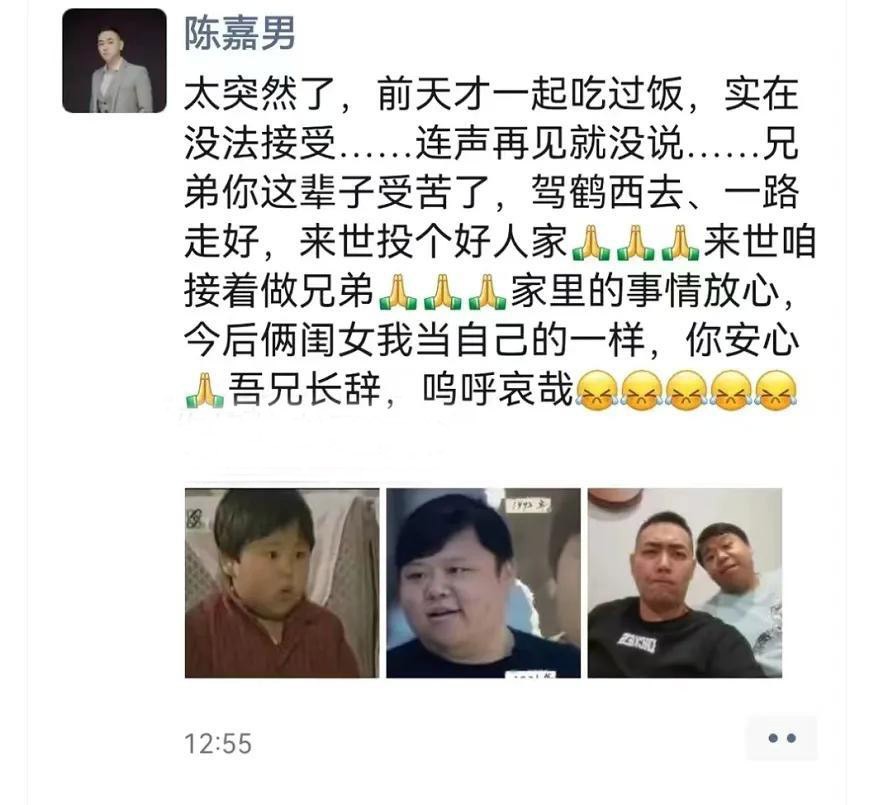 陈晨的好友陈嘉男得知消息后,感觉非常震惊,不敢相信这是真的,可能和他的家人证实了这一消息,在朋友圈发文哀悼。