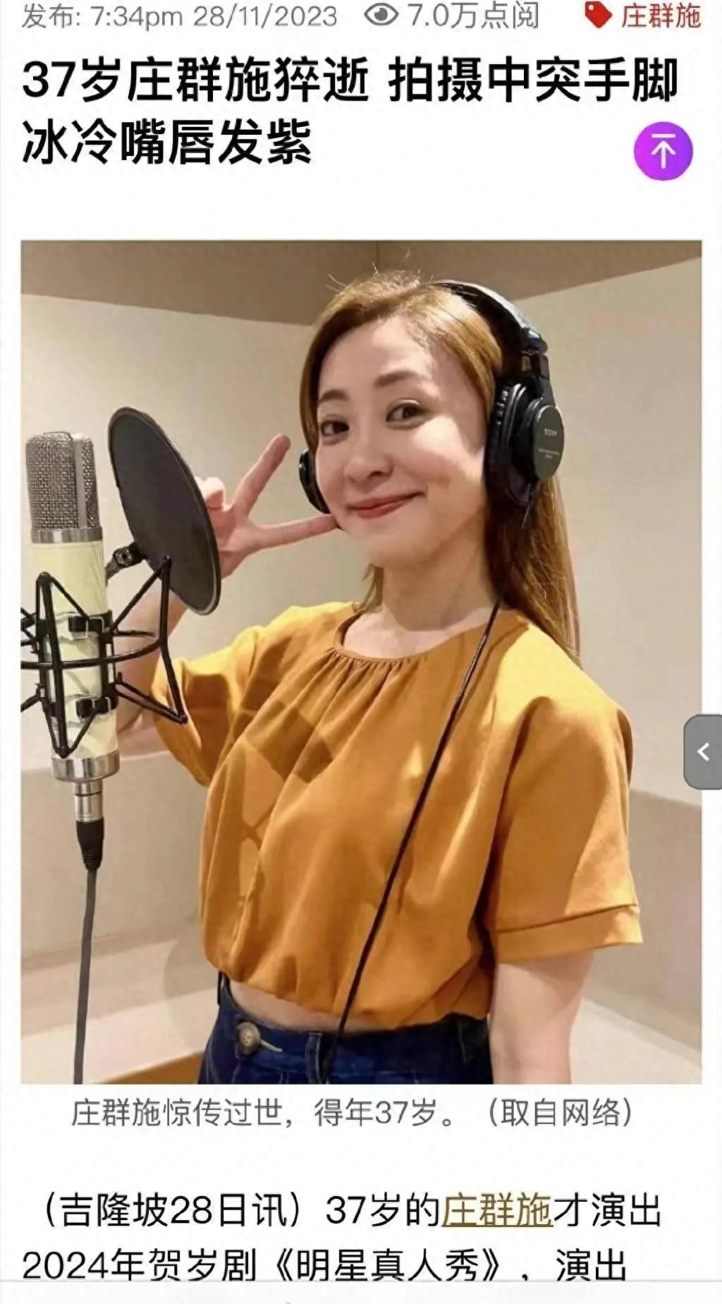 标题:【震撼揭秘】37岁女星庄群施猝死原因,背后的故事让人心痛!