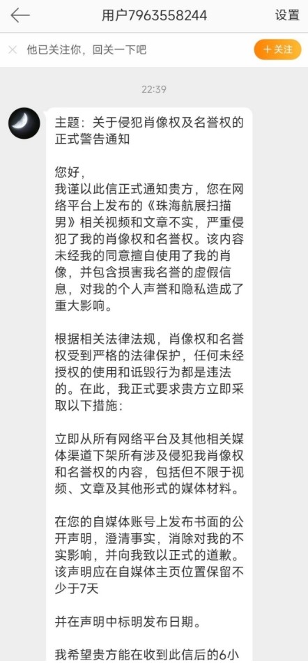 要求在6个小时内必须删除关于该男子的一切照片视频,否者就要起诉博主。