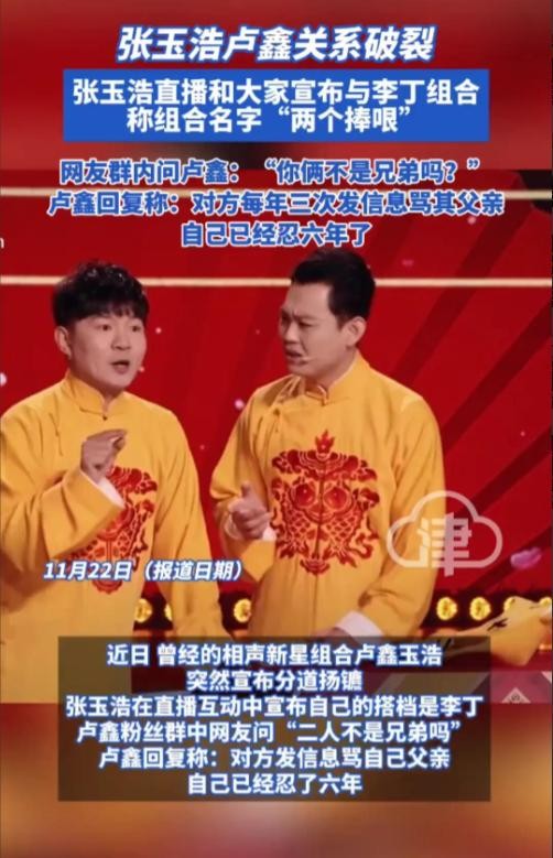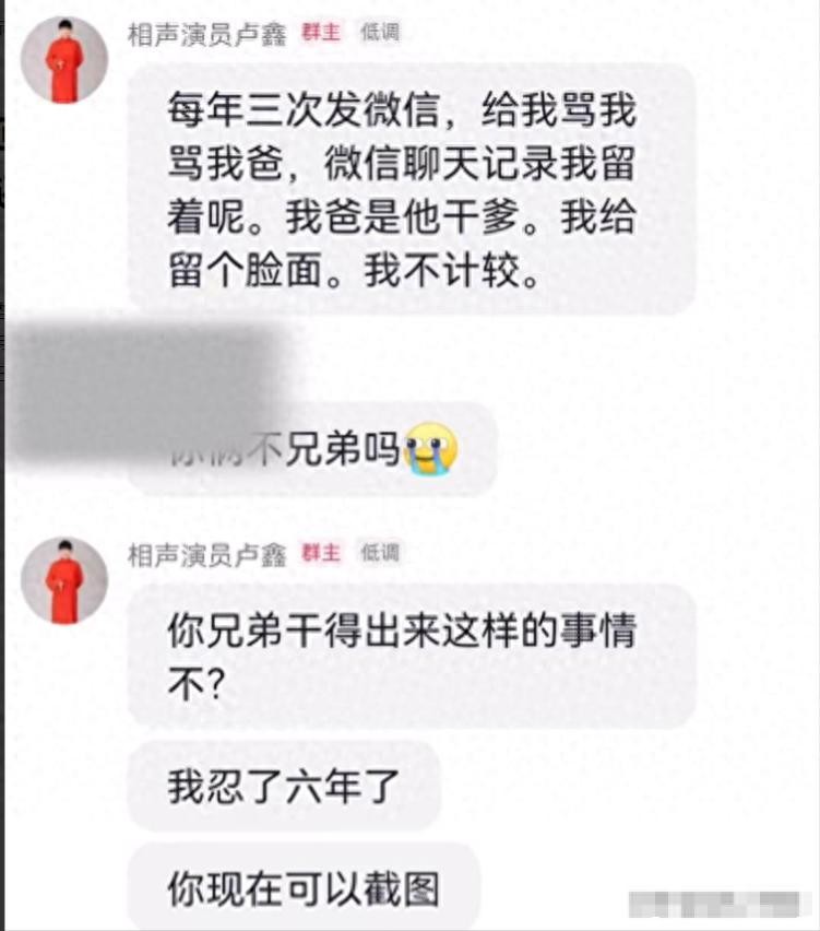 早前,相声新势力张玉浩因在直播中称自己的搭档是李丁,从而惹来外界网友非议,难道说张玉浩与搭档卢鑫已经决裂?随后,有粉丝在群中询问卢鑫,对此,卢鑫表示:对方每年三次辱骂其父亲。
