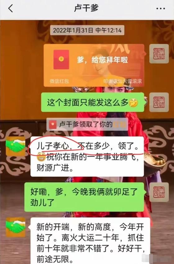 至于那个玉浩是不是真的每年都三次骂卢鑫的父亲,也就是他的干爹,这事还真不好说。玉浩直接晒出了和卢干爹的私密聊天截图,从截图看,他和卢干爹关系挺不错的,过年过节的红包也不少,几百一个。