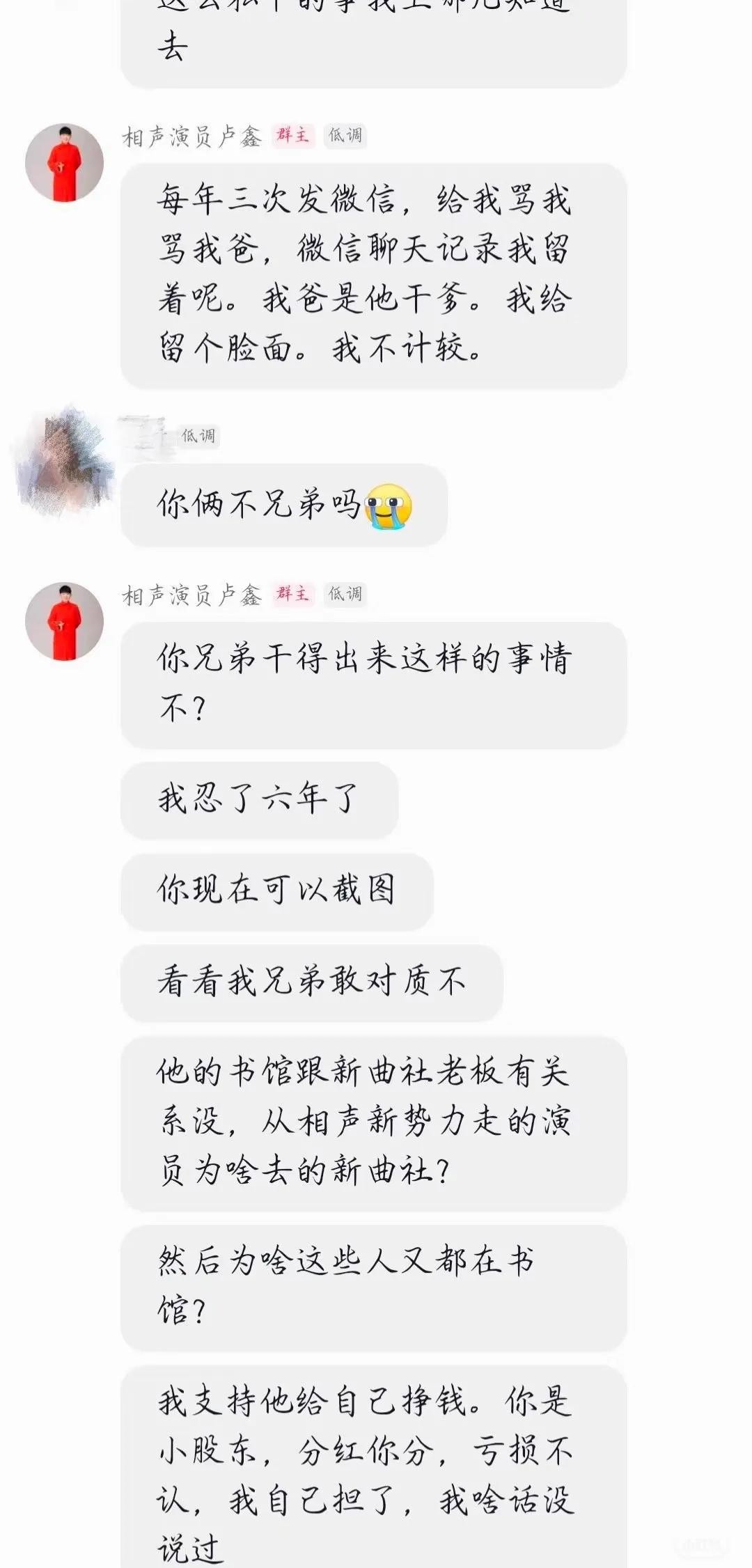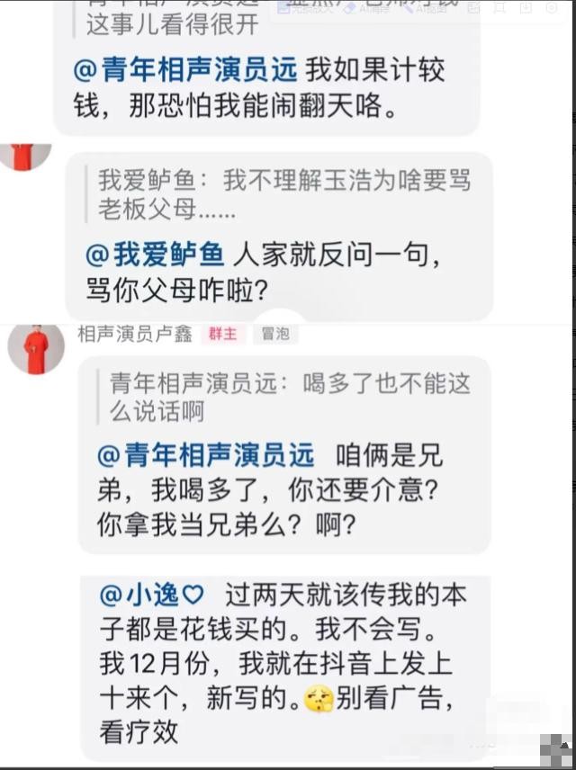 他还说了,现在为了生活,他不得不找新的搭档继续前行。玉浩还分享了一些图片,是卢鑫在粉丝群里回答问题的截图,情绪特别激动,说话还带脏字。这就在一些未成年粉丝还要写作业的时候,他说了一大堆,结果让玉浩也跟着被批评了。