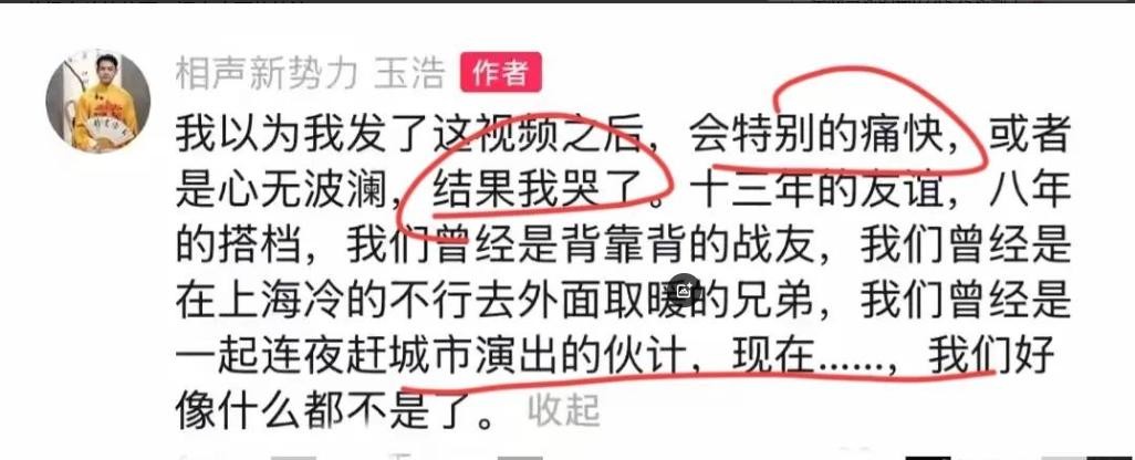 发完视频后的玉浩,真是又难受又心痛,哭成一片。想想他们十三年的深厚友情,一夜之间就翻篇了,那些年一起拼搏的日子,一想起来眼泪就止不住。这不光是他自己难受,我们这些旁观的,看他这么描述,都忍不住要掉眼泪了。