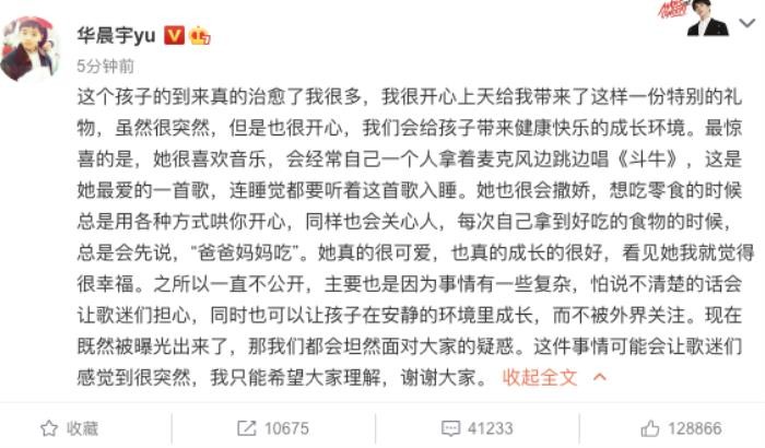 但我还是觉得,这次的主人公跟其他被锤感情的男偶像们有本质区别——大家可以看一下华晨宇紧随其后发的文字,字里行间都有对这个孩子的到来的欣喜。