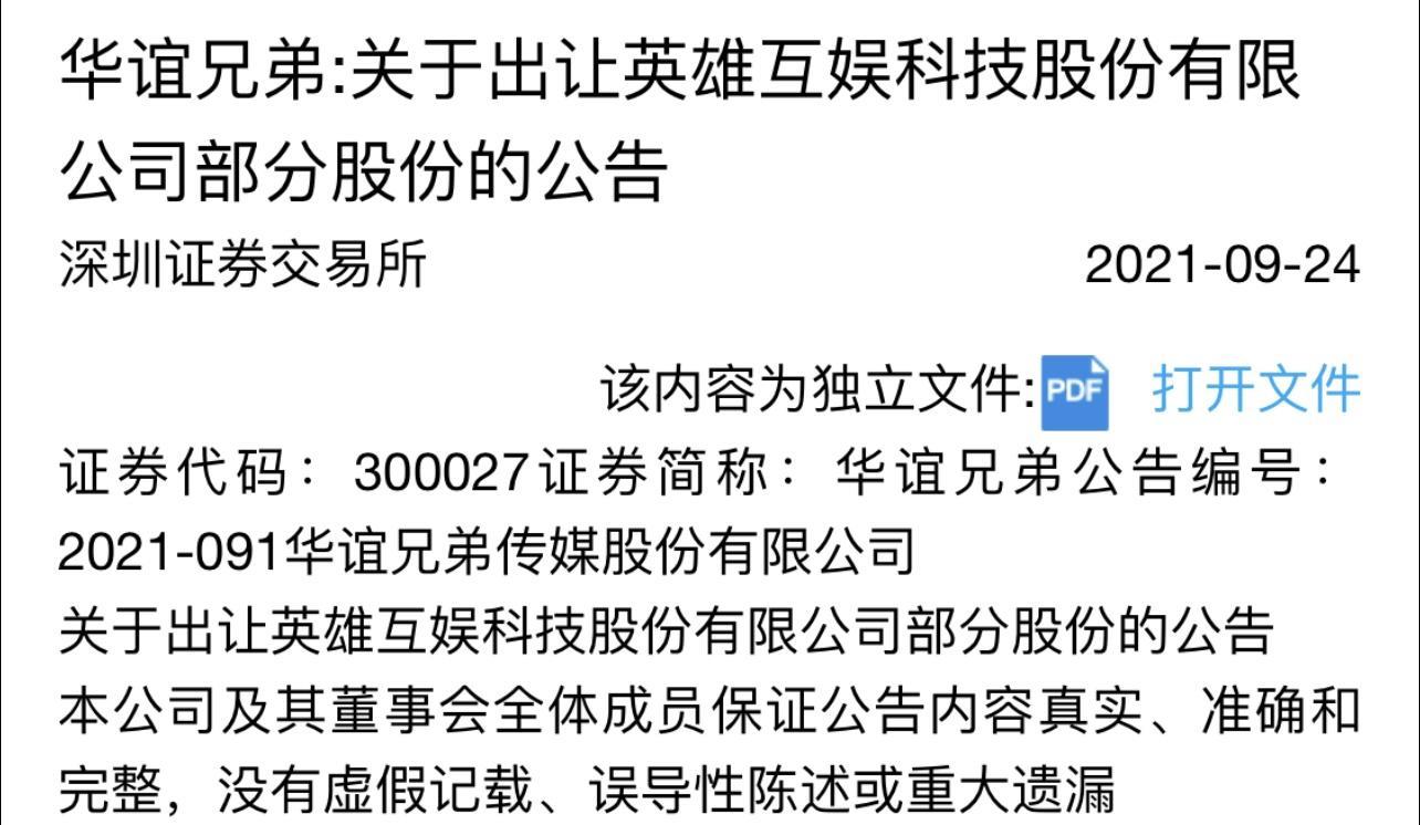 华谊兄弟不停变卖资产套现并没有挽救危局,在9月发布的公告中宣布出让英雄互娱的部分股权。