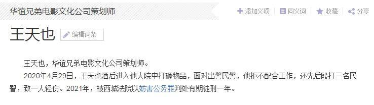 报道称,去年4月时,王天也在昌平某别墅区内醉酒闹事,民警赶到现场后,他不但不配合执法,还暴力袭击警务人员。