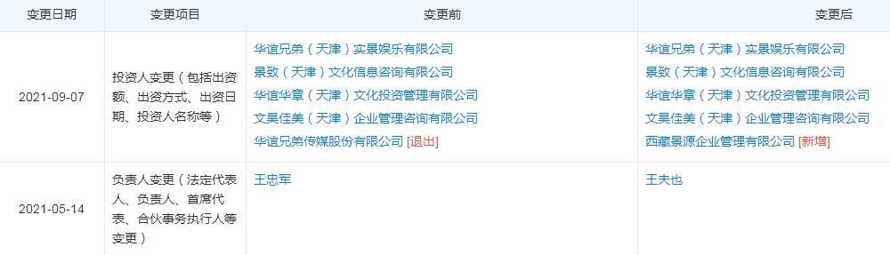 根据天眼查平台显示,王天也名下目前有一家影视文化公司,与华谊兄弟有股权交集。