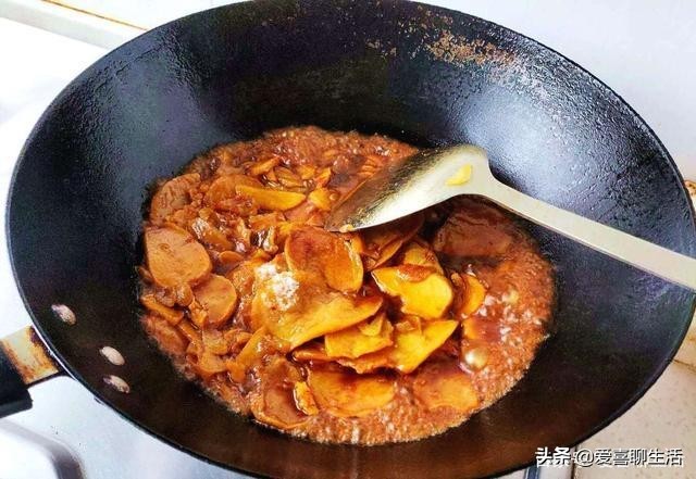 3 倒入土豆干,紧接着加入牛肉酱,炒出酱香味后倒入浸泡好的土豆干,(牛肉酱就是朋友说的必不可少的一味调料,它是这道菜的核心,有了它就有了土豆干的鲜美。)