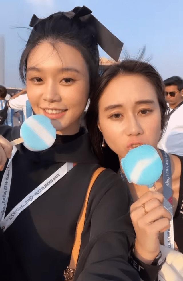在奚梦瑶和赌王小女儿何超欣合照时,两人都吃着蓝色的雪糕,十分享受。可以看出奚梦瑶比何超欣高出了一个头,不愧是超模出身,身材比例非常好。何超欣戴着金色戒指,看得出来价值很高。奚梦瑶则是戴着黑色大蝴蝶结,十分可爱活泼。