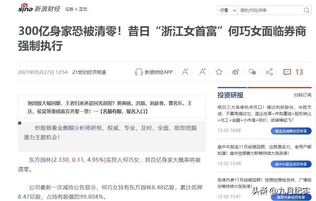 21世纪经济报道2021年05月27日报道:300亿身家恐被清零!昔日“浙江女首富”何巧女面临券商强制执行