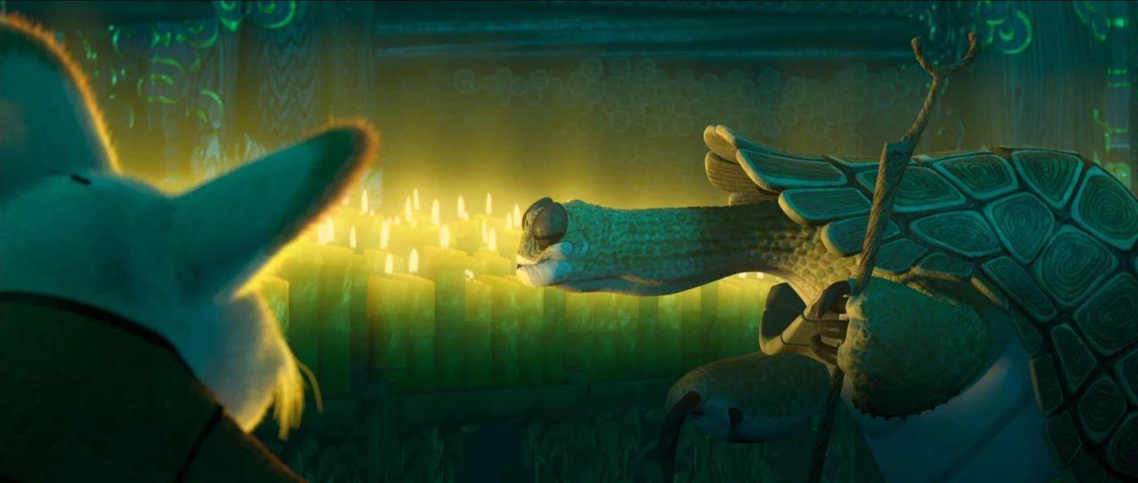 在影片一开始,乌龟大师耐心地一个接一个地吹蜡烛,浣熊师父见了直接一个气功把所有蜡烛吹灭了。