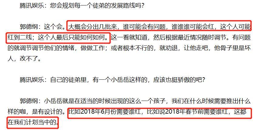 2016年,郭德纲接受腾讯娱乐采访,曾明确说过,什么时候捧什么人,捧成什么咖位都是有规划的。