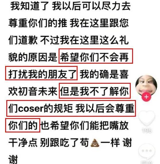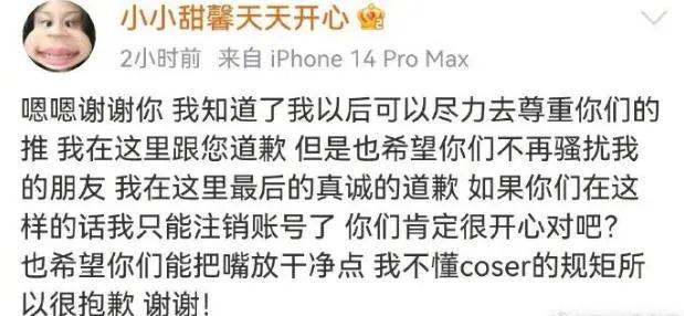 并解释是自己不懂 coser 圈的规矩,以后会尊重。