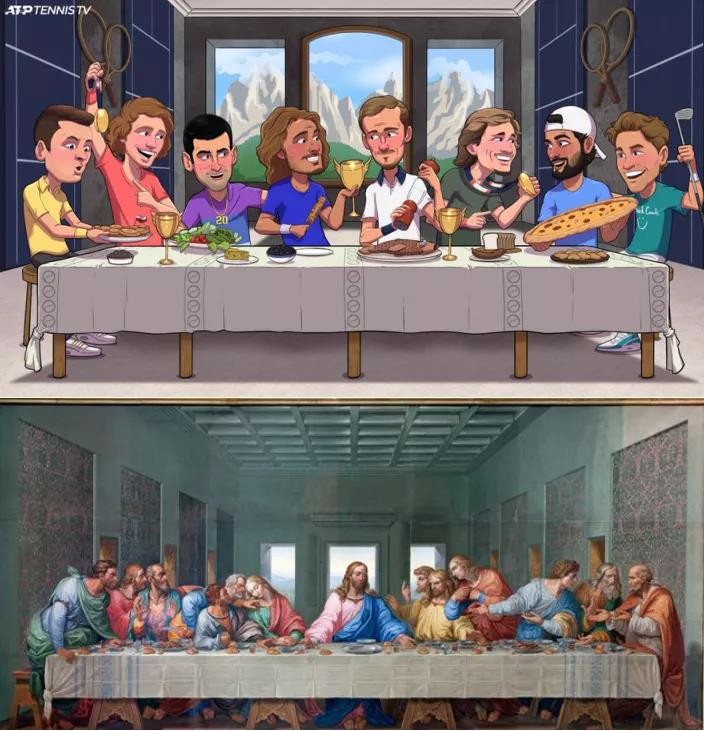 明眼人一看便知,上面这幅图模仿的是达芬奇的名画《最后的晚餐》。达芬奇是意大利文艺复兴时期的著名画家、工程师和科学家,其最具代表性的画作就是《蒙娜丽莎》和《最后的晚餐》。TennisTV在这个时刻推出这幅画,既表明了目前的ATP年终总决赛是今年网球界的“最后盛宴”,同时今年也是意大利都灵首次承办这项重大赛事,模仿达芬奇的名作也是为了致敬意大利。