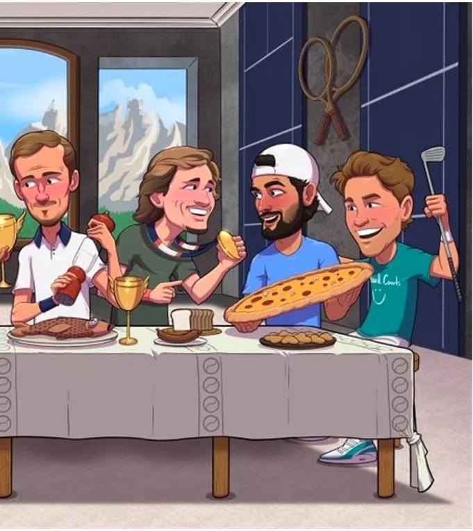 相比起来,TennisTV的《最后的晚餐》人物显然是今年参加年终总决赛的八位球员,而其中人物形象、动作、打扮以及面前的食物也都是精心谋划,其中蕴含着诸多深意。