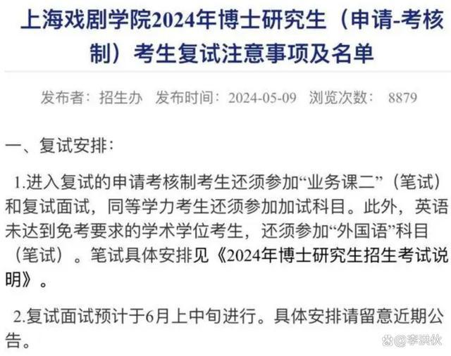 近日,上海戏剧学院发布该校 2024 年博士研究生(申请 - 考核制)考生复试名单。