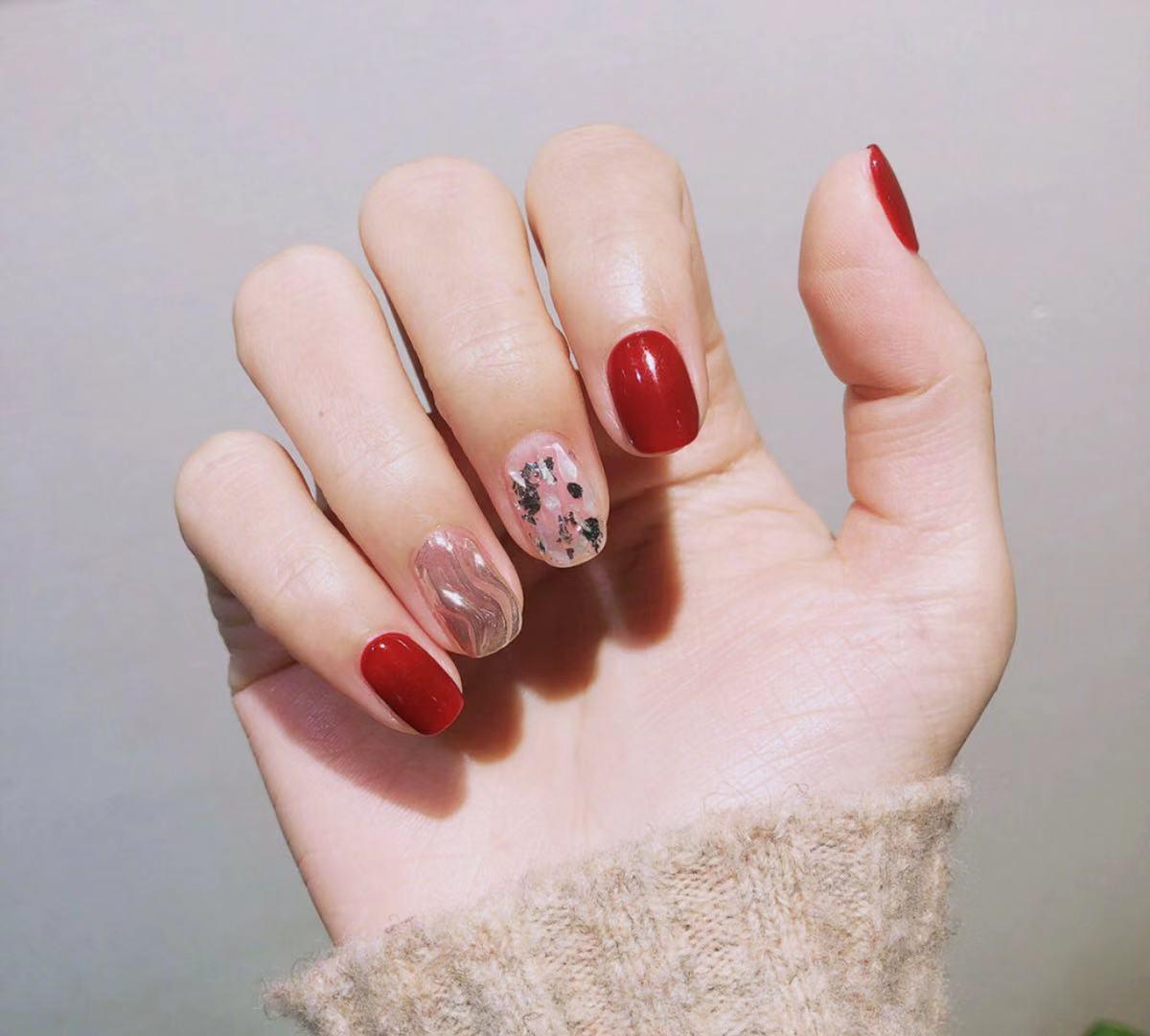 我们也可以用红色的纯色美甲,搭配上精致的亮片美甲,或者是搭配上裸透质感的发光美甲,这样在视觉上会有更明显的层次感,相比单一的纯色美甲,这样的搭配会更有亮点。
