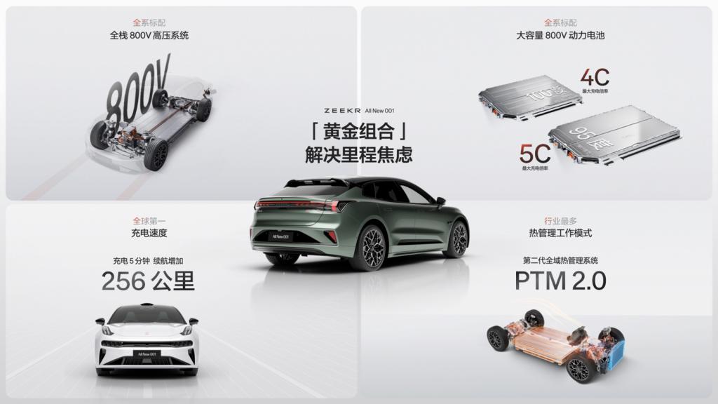 官方表示,新款极氪 001 全系采用 800V 架构,全系配备大容量电池,拥有全球最快充电速度、全域热管理技术。