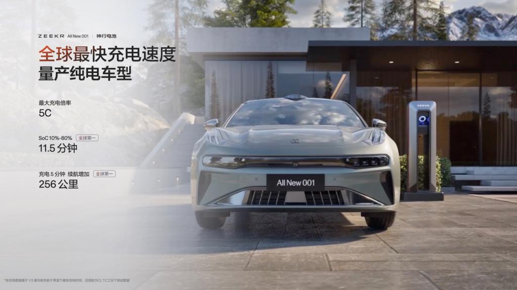 据介绍,全新极氪 001 在性能、安全、座舱、智驾,方面全部升级,新车将搭载宁德时代神行电池,充电 5 分钟续航增加 256 公里,这也是全球充电速度最快的量产纯电车型。