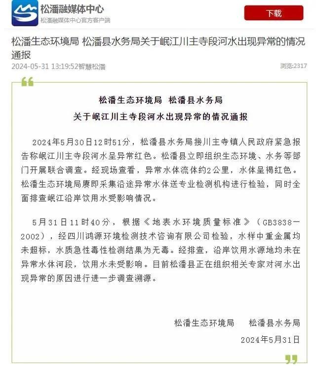 5 月 31 日 11 时 40 分,根据《地表水环境质量标准》(GB3838 — 2002),经四川鸿源环境检测技术咨询有限公司检验,水样中重金属均未超标,水质急性毒性检测结果为无毒。经排查,沿岸饮用水源地均未在异常水体河段,饮用水未受影响。目前松潘县正在组织相关专家对河水出现异常的原因进行进一步调查溯源。