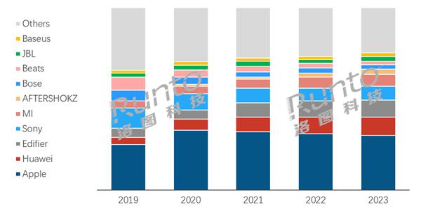 随着 2016 年 AirPods 进入耳机耳麦市场,苹果迅速主导了市场,并长期占据市场第一。