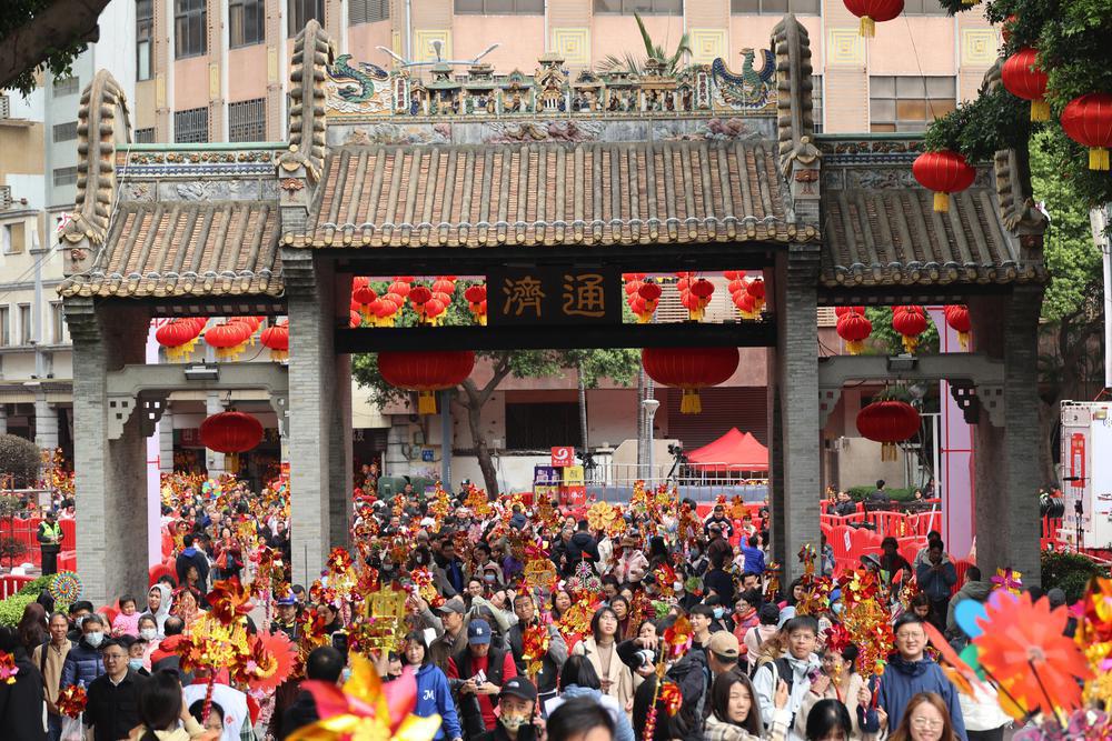 娃娃们骑在大人肩头,成千上万风车随风转动,人们手中提着一棵又一棵生菜,行过通济桥,带着喜庆和好意头归家……今年的佛山 " 行通济 " 大型民俗文化活动于 2 月 23 日、24 日、25 日(正月十四、正月十五、正月十六)举行。24 日中午时分起,行通济开始迎来火热阶段,通济桥及周边路线已是人潮涌动、摩肩接踵。