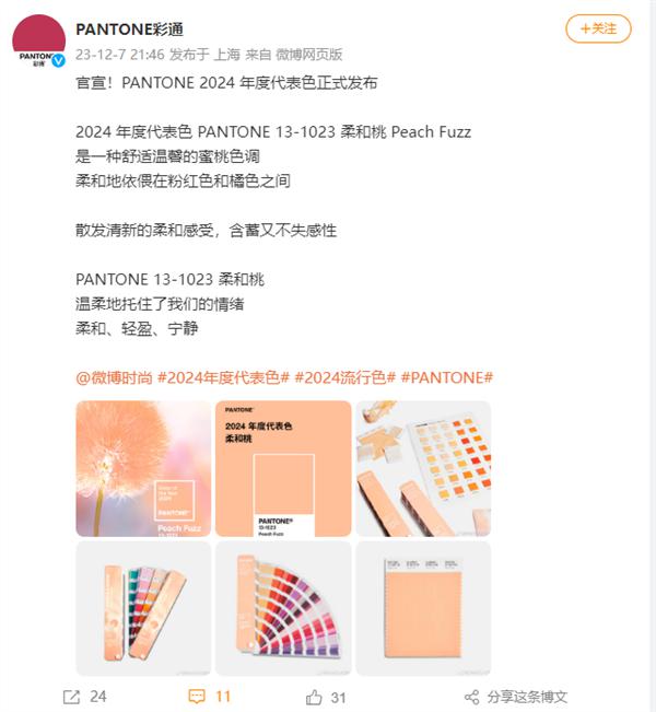 这款新版本采用了潘通 2024 年度代表色—— PANTONE 13-1023 柔和桃 Peach Fuzz。