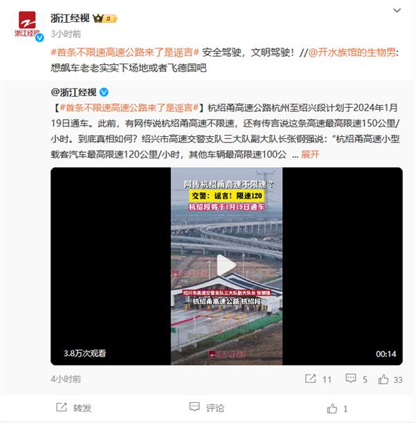 而此前,曾有传言说杭绍甬高速为不限速高速,还有传言说该高速公路最高限速为 150 公里 / 每小时。