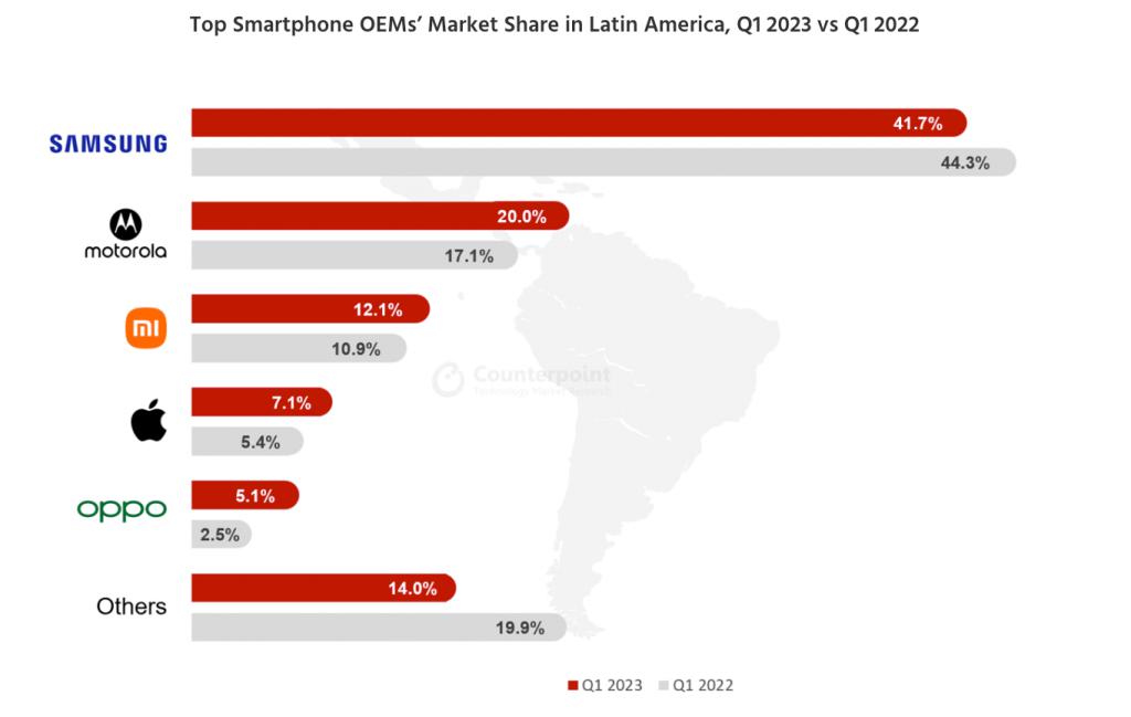 ↑ 2025Q1 拉丁美洲智能手机份额排名 小米第三 图源 Counterpoint