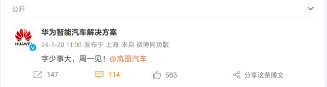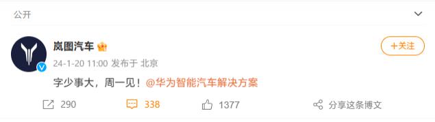 IT 之家 1 月 20 日消息,今天上午,@岚图汽车 和 @华为智能汽车解决方案 两家官微同时发了一条微博:" 字少事大,周一见!" 并互相 @了对方账号。