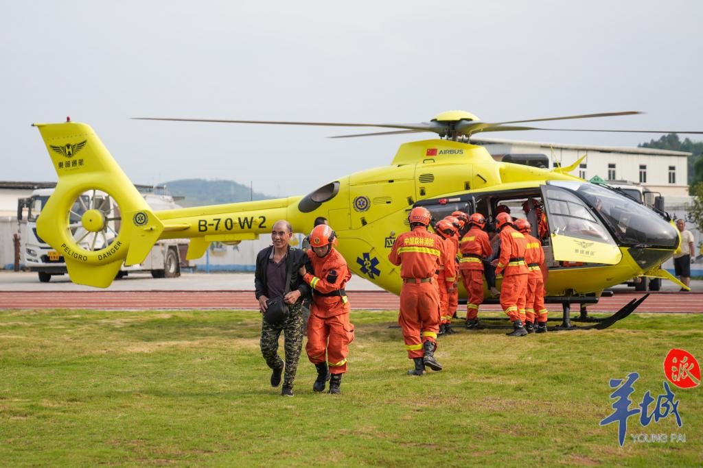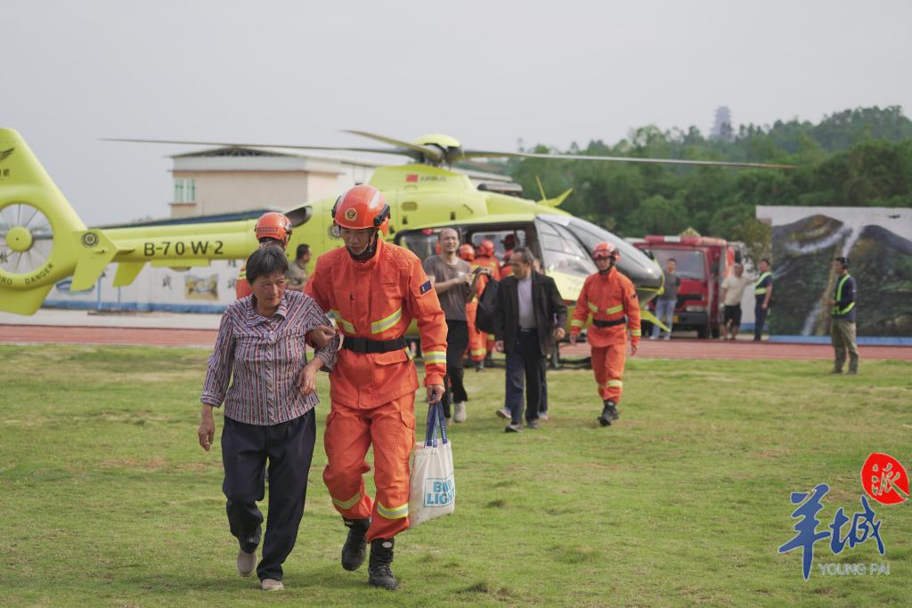 为进一步做好防汛救灾工作,在韶关市武江区江湾镇,居民们通过空路直升机、陆路大巴车转运等形式被转移至市区安全地点。