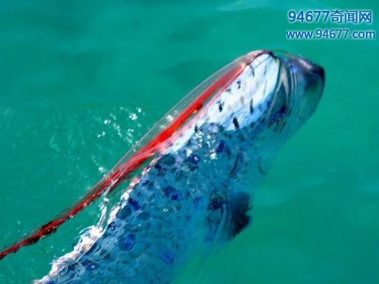 它是海洋中最长的硬骨鱼,体亮银色;腹鳍红色,桨状,故英文原意为“桨鱼”。背鳍亦呈红色,很长,有两层楼那么高,始於头顶如鬃冠。很少见于水面,有人偶尔见到,误为“海蛇”。人们通常认为它们是横扫海底,摧毁一切的怪兽,也曾被东南亚误认为传说中的“龙”。