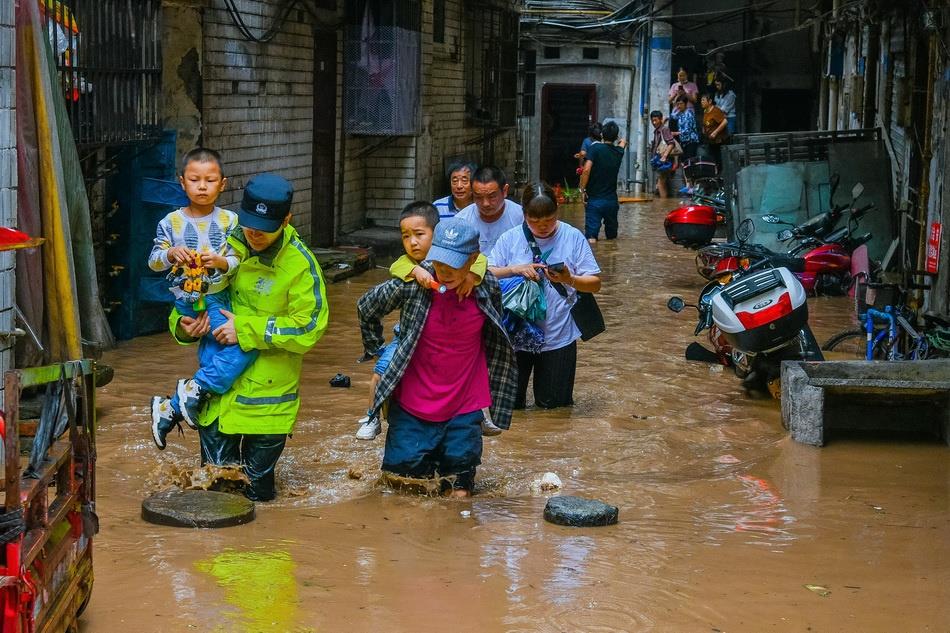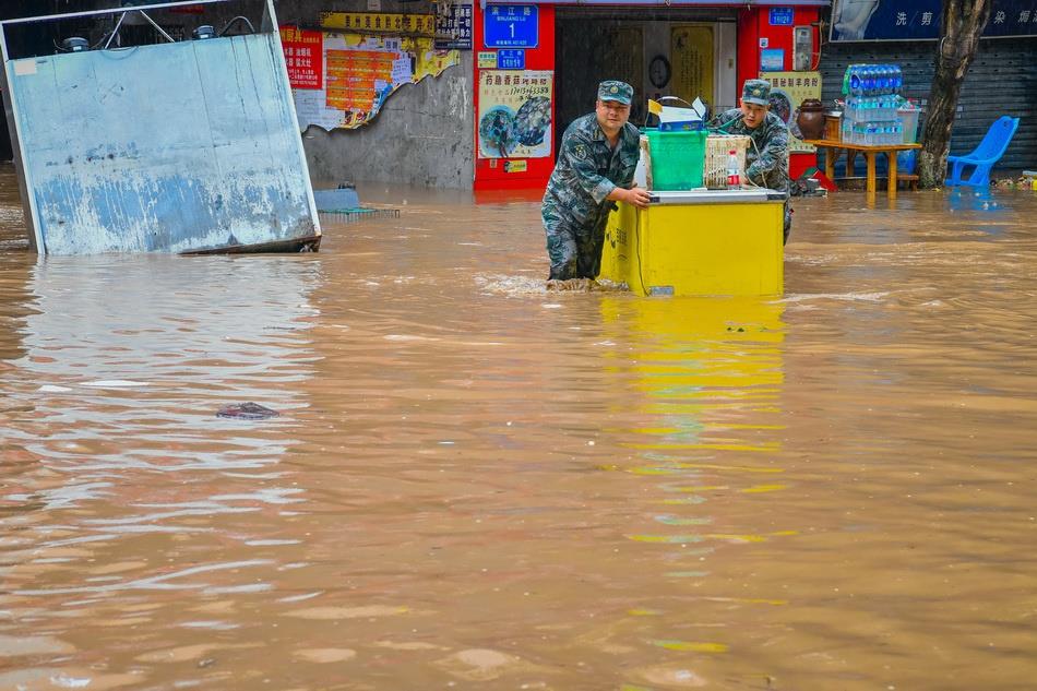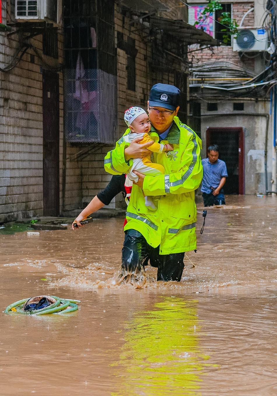 6月22日,重庆綦江区北街居民楼被淹,警察及时转移被困群众。截至22日18时,綦江区共有21个街镇4万余人受灾,紧急疏散近10万人,转移近4万人。