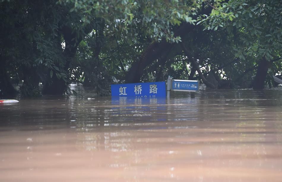 6月22日,洪峰从重庆綦江过境时,城区的道路指示牌被淹。